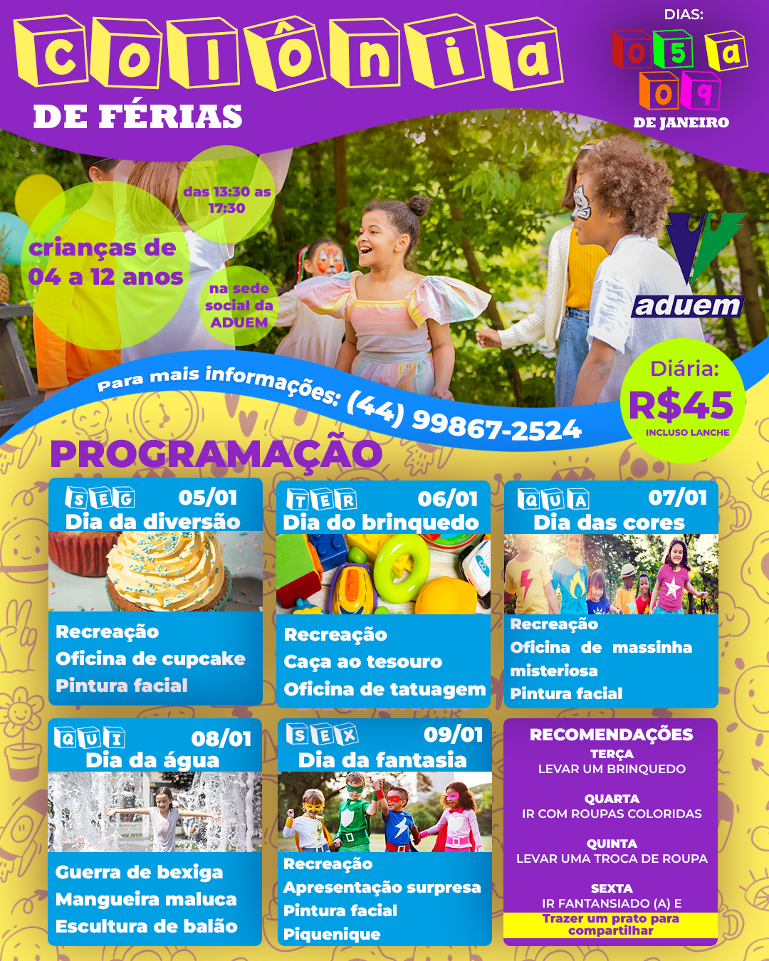 Programação especial todos os dias: recreação, oficinas temáticas, pintura facial, gincanas e muito mais!